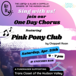 Join us on Saturday, April 25th for our next One Day Chorus featuring Pink Pony Club by Chappell Roan, at Unicorn Bar in Kingston. If you love to sing, on stage or in the shower, this event is for you! It’s about community, connection, and the simple thrill of making music together. Proceeds benefit Trans Closet of the Hudson Valley. Get tickets and more info here.